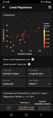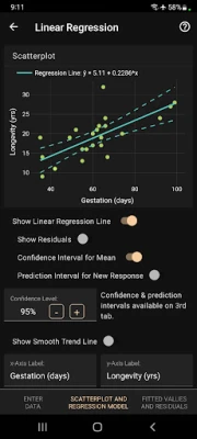The app computes and displays confidence intervals for the mean response and prediction intervals for a future response. The fitted model and the intervals are visualized on the scatterplot, and you can obtain and plot raw and standardized residuals.