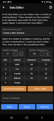 For data entry, you can enter your own data via the new Data Editor app, import a CSV file, or choose from several pre-loaded example datasets.